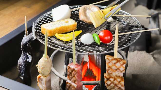 伊藤さん:はい、囲炉裏はすべてオーダーメイドで作りました。市販されていないものなので、細部までこだわっています。全卓に囲炉裏が付いているテーブル型のスタイルは珍しいと思います。通常、炉端焼きのお店は大きな囲炉裏がひとつドンと置いてあり周りを囲むスタイルですが、当店ではお客様それぞれが、自分たちの専用の囲炉裏で焼く体験ができます。私たちはこれを「ジャパニーズバーベキュー」と呼んでいます。一般的な韓国式と対比させ、インバウンドのお客様も意識してこのコンセプトを打ち出しています。料理長は帝国ホテルのなだ万でキャリアを積んでいますので味には自信がありますよ。