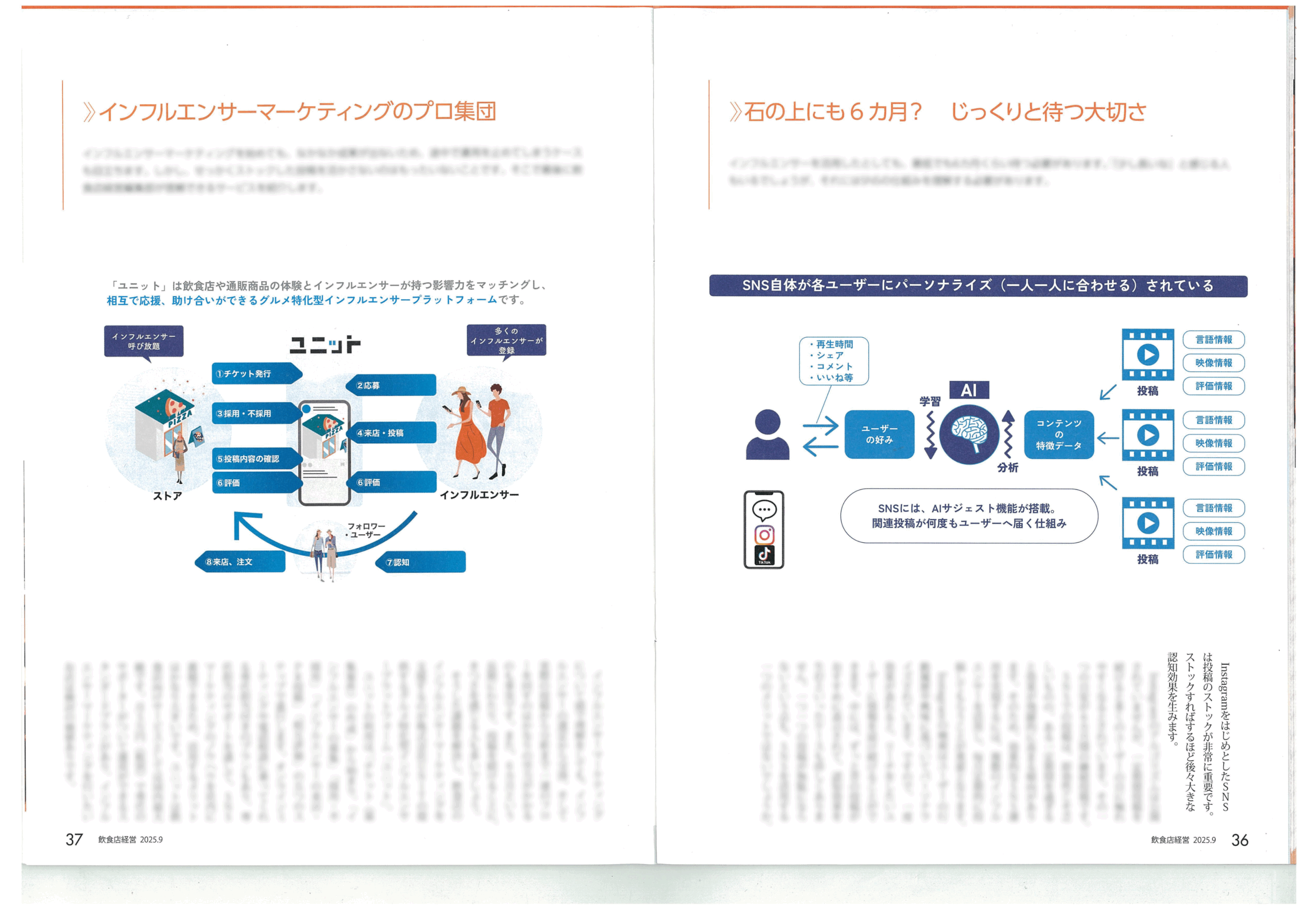 「飲食店経営 2025年9月号」にて掲載して頂きました! 『インフルエンサーマーケティングのプロ 株式会社UNITが教える極意』にて掲載いただきました。 『インフルエンサーマーケティングで飲食店を成功に導くマル秘ノウハウ』についてお話をさせていただきました。 【飲食店経営】
